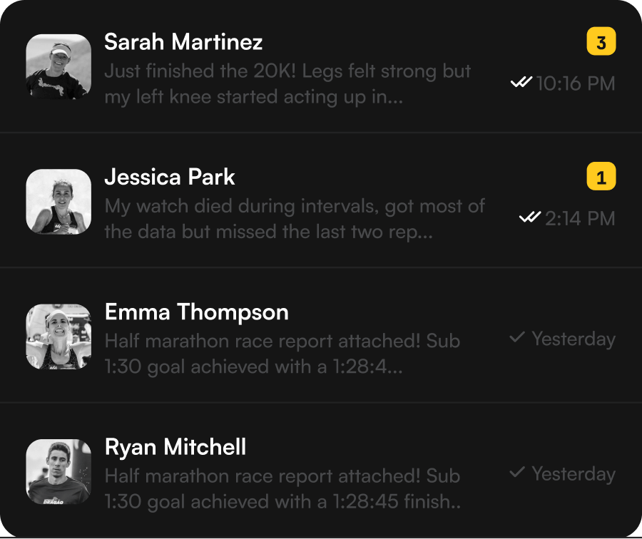 Every athlete conversation in one unified place. No more switching between platforms or losing context in scattered messages. Stay connected and responsive without the friction.